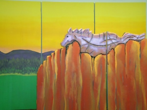 Debbie is painting the backdrop and set for our community VBS. This year the theme is "Saddle Ridge Ranch," which is available at LifeWay stores. We partner with 4 other community churches -- a Presbyterian church, two United Methodist churches, and another Baptist church -- for VBS each year. All of our churches have about the same attendance, which is under 100 on average, so partnering with other churches helps share the cost, provides lots of adult helpers, and lots of kids for VBS.